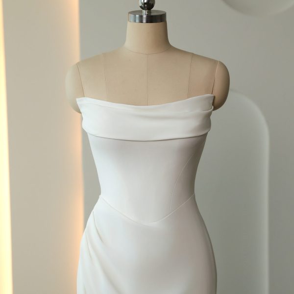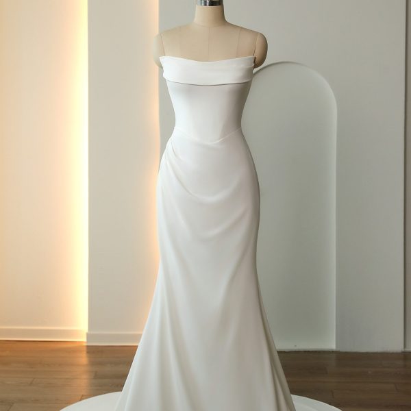 £1,100.00The Pianura strapless sheath wedding dress features a sleek, form-fitting silhouette that gently flares at the hips into a smooth, flowing train. Designed with a modern scoop neckline and a minimalist aesthetic, the gown highlights the natural beauty of the fabric. Subtle pleated detailing adds a distinctive touch, creating a timeless and effortlessly sophisticated bridal look.