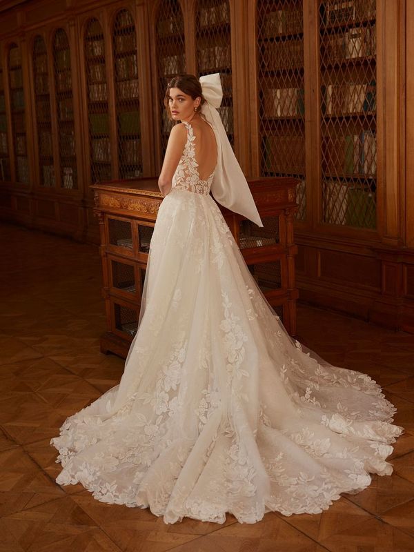 A charming lace wedding gown with dreamy illusion straps, a V-neck, and a flattering A-line silhouette.