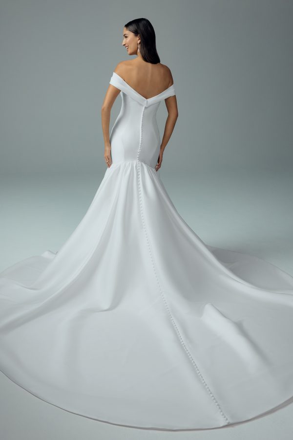 Paloma is a striking mermaid wedding dress crafted from luxurious Mikado, designed to sculpt and enhance the figure with refined elegance. Featuring a structured bodice with off-the-shoulder straps that form a romantic sweetheart neckline, the gown flows into a dramatic mermaid skirt with pleats and panels for added volume. Finished with fabric-covered buttons cascading down the back to a chapel-length train, Paloma is perfect for brides seeking a minimalist yet unforgettable statement.