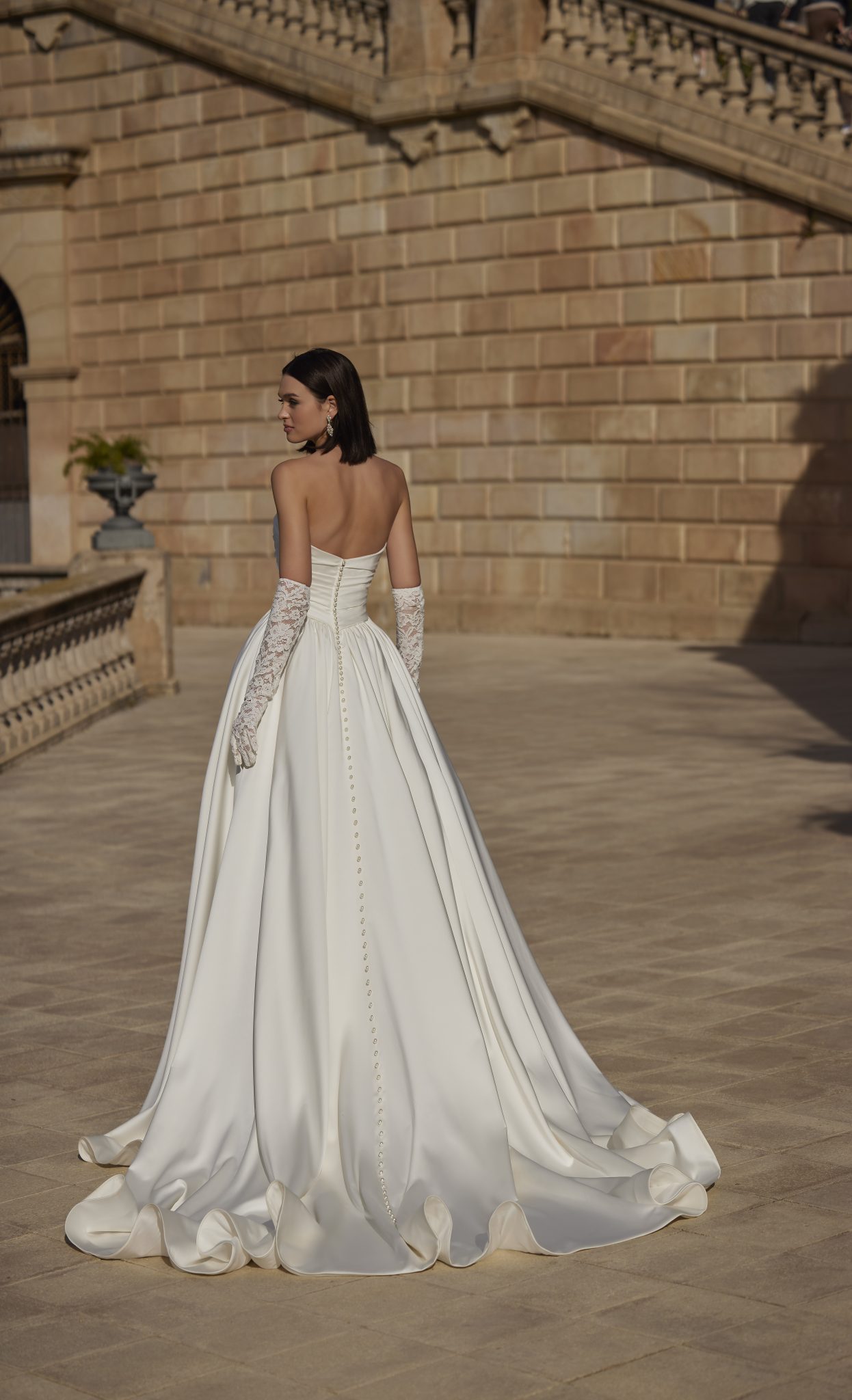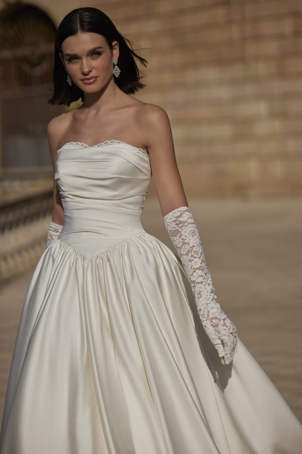 This strapless ballgown delivers a refined, modern take on classic bridal design. A subtle peekaboo lace detail enhances the sweetheart neckline, while the structured drop waist creates a clean, elongated silhouette. Finished with sheer lace long gloves, the look balances sophistication and timeless elegance.