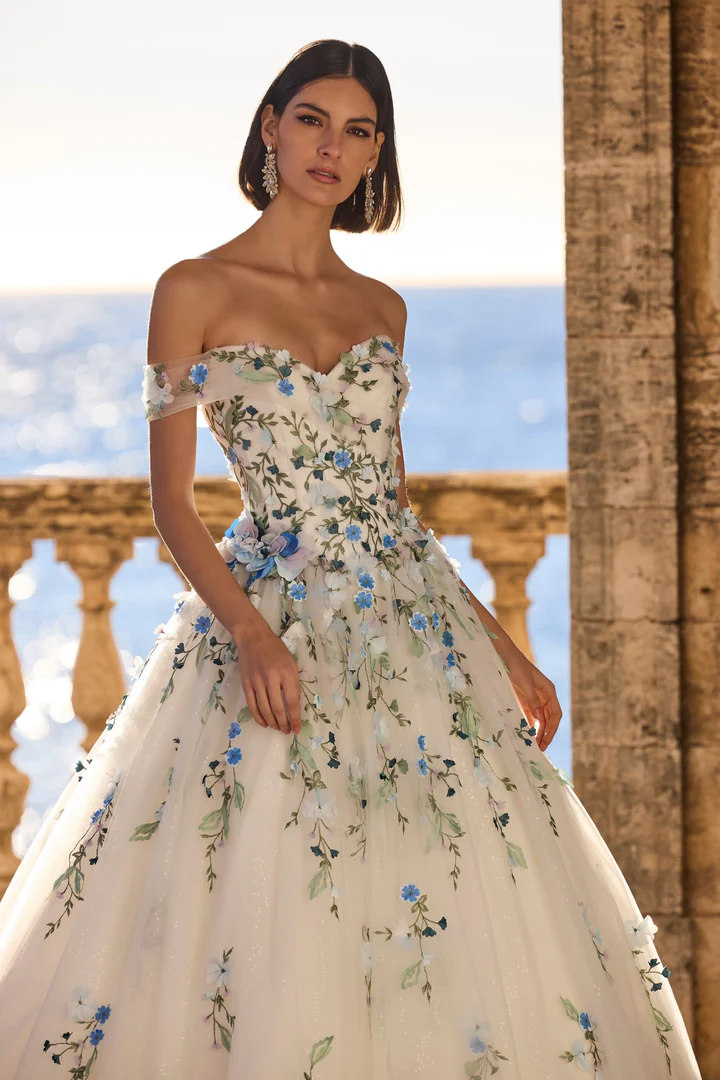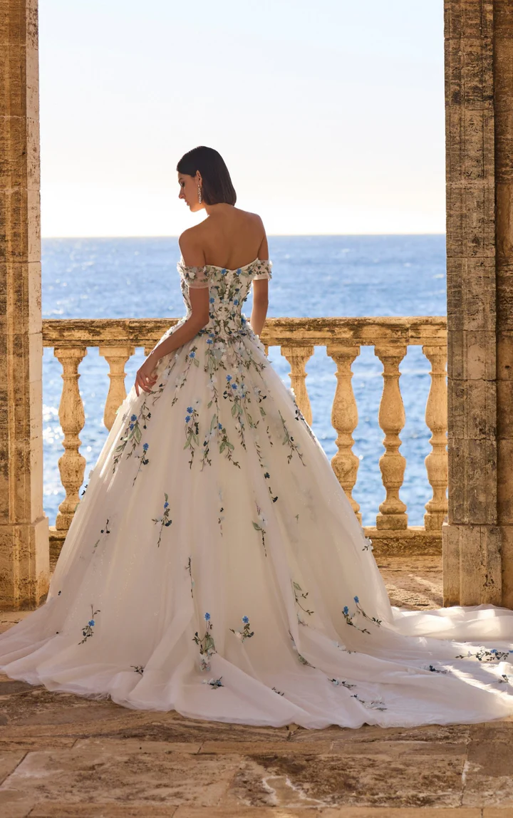 This off-the-shoulder ball gown wedding dress is crafted from airy, layered tulle and adorned with hand-placed floral appliqués in soft blue and green hues, creating a romantic garden-inspired look. The structured sweetheart bodice enhances the silhouette, while the full, flowing skirt adds ethereal movement and light-catching elegance. Perfect for outdoor, coastal, or destination weddings, this gown blends timeless beauty with couture artistry.