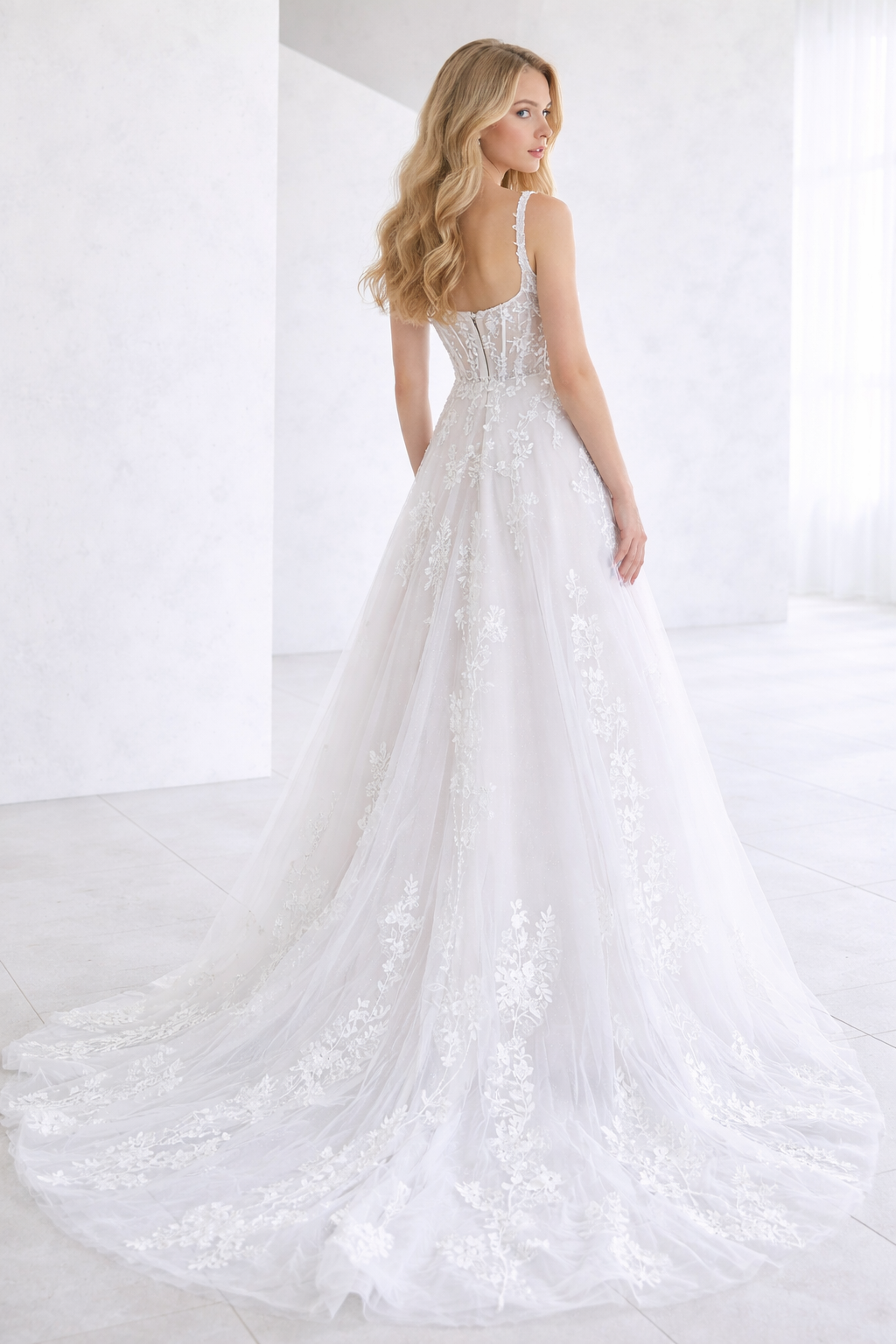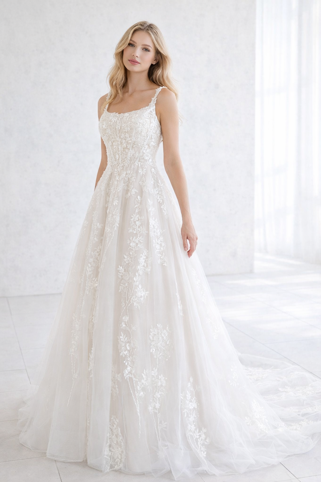 The square neckline bridal gown elegantly captures timeless beauty with its A-line silhouette, adorned with intricate beaded lace appliques