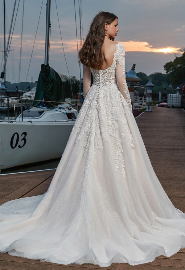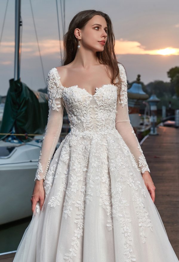 The elegant long sleeves wedding dress features a romantic sweetheart neckline that beautifully frames the décolletage, complemented by a graceful A-line skirt that flows effortlessly into a breathtaking cathedral train. Adorned with exquisite beaded lace embellishments, this gown captures a timeless charm, ensuring the bride radiates sophistication and grace on her special day. Each detail is crafted to create a stunning look that enhances both beauty and femininity, making it the perfect choice for a memorable wedding ceremony.