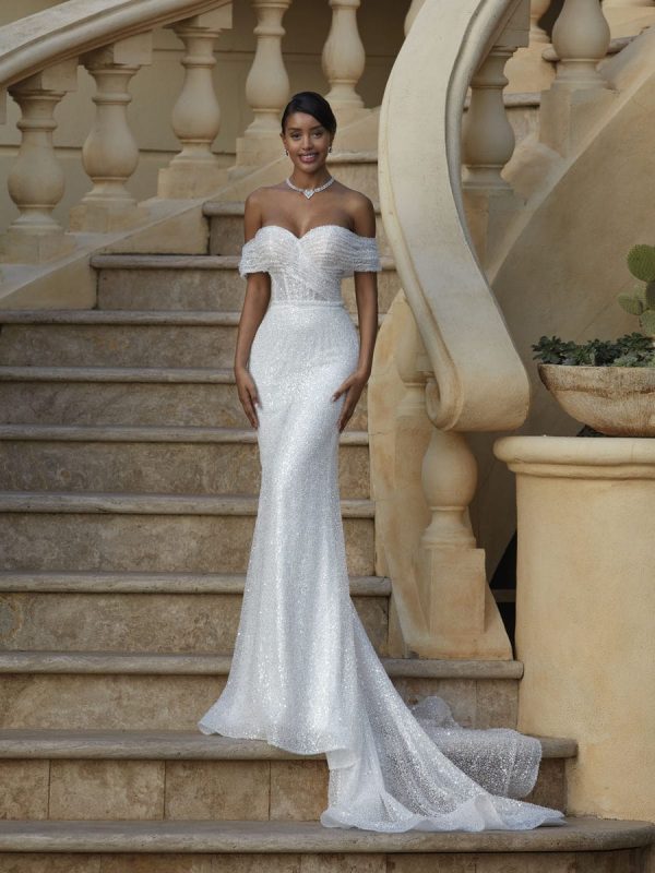 Off-the-shoulder neckline with Fit and Flare silhouette finished with lavish detachable skirt/train.