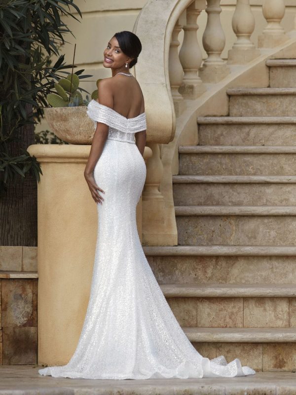 Style 1252 Demetrios by Italian bridal designer complete modern, luxury glamour look.