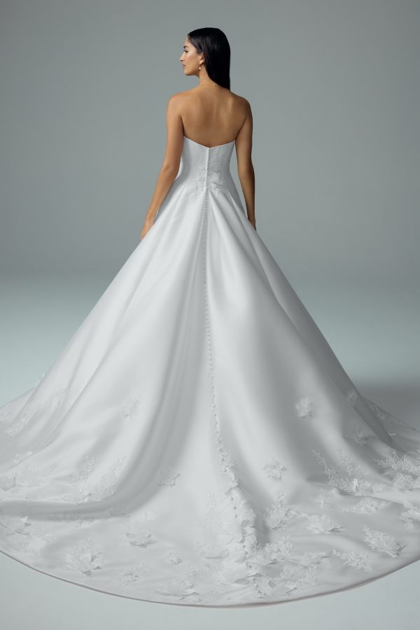 Nala is a timeless Mikado ball gown wedding dress that blends classic elegance with modern sophistication. Featuring a strapless sweetheart neckline with a subtle plunge, the draped bodice beautifully defines the waist for a flattering silhouette. Intricate floral appliqués and 3D flowers add texture and dimension, cascading asymmetrically across the bodice and flowing into the skirt and sweeping train. Finished with fabric-covered buttons, this gown is perfect for brides seeking romance, poise, and unforgettable bridal elegance.